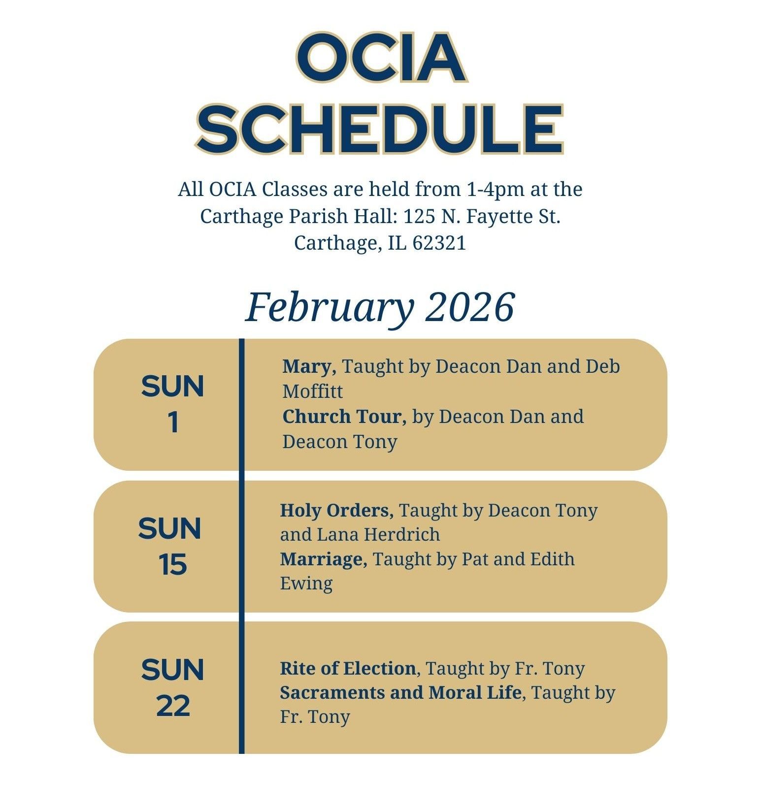 Our OCIA Team is lead by Gene Taylor. Gene is a life long Catholic, Parishioner, Father, and Spiritual Leader. Gene and his wife Lora, our Deacons and their wives, Fr. Tony and Parishioners Pat and Edith Ewing create our core OCIA teaching team.
